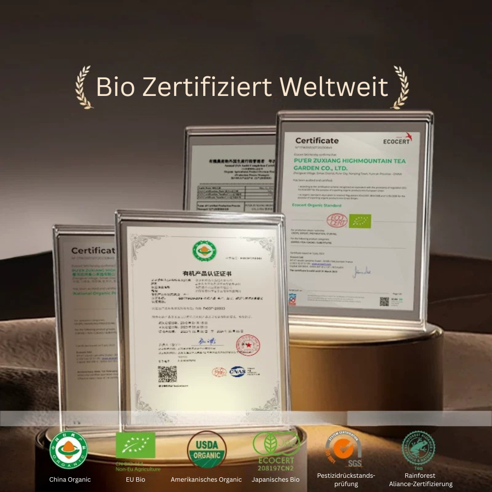 Die Produktion erfolgt 100 % biologisch, ohne Zusatzstoffe, und unterliegt regelmäßigen unabhängigen Kontrollen gemäß chinesischem Bio-Standard. Der Tee eignet sich sowohl für Einsteiger als auch für erfahrene Pu-Erh-Trinker, die Wert auf Reinheit, Alltagstauglichkeit und stabile Qualität legen.